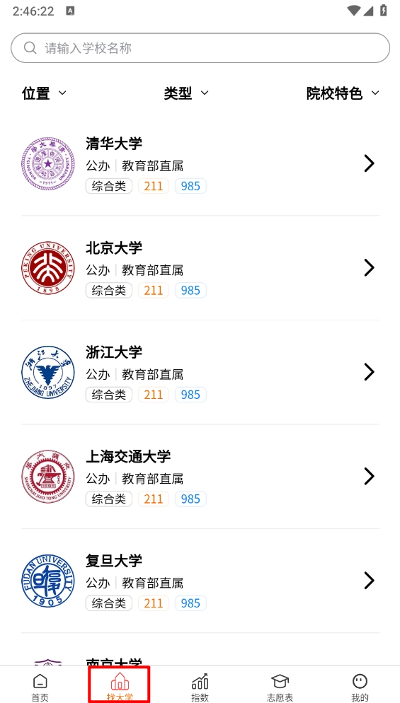 4、切换至"找大学"板块,滑动就可以选择所需了解的大学。