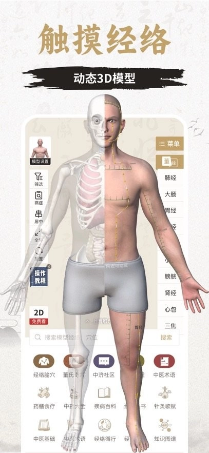 专业3D人体经络穴位解剖模型,精准呈现十二正经、奇经八脉、经外奇穴,搭配真人取穴视频、针灸进针动画、董氏奇穴3D演示,实操学习更直观!
