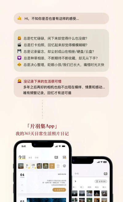 片羽集照片日记软件的核心功能是协助用户记录生活日常,用户能通过多种形式留存生活中的点滴瞬间,便捷地创建多本个人专属的照片日记,助力用户更好地珍藏那些美好的回忆。此外,软件支持对照片笔记一键保存,并可生成个性化照片墙,方便用户随时回顾过往。
