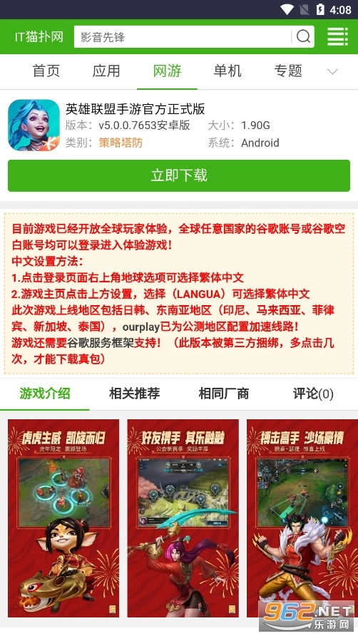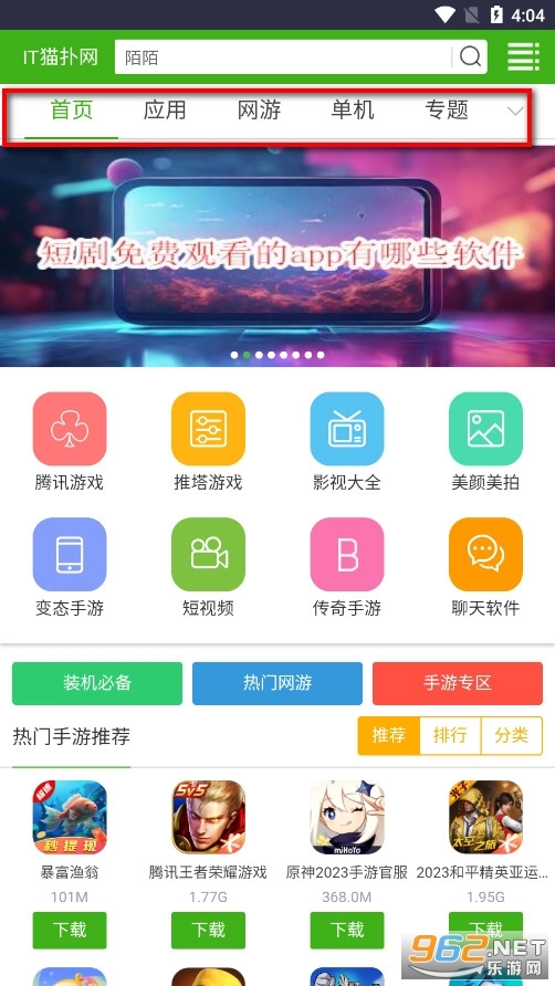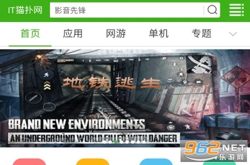 打开IT猫扑网,界面布局和网页版类似,设有首页、应用、网游、单机、专题等多个分类板块。