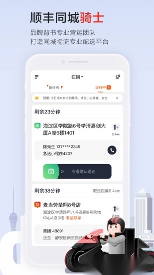 顺丰急送专注同城配送的专业团队!打造同城物流专业配送平台!顺丰同城骑士是一款为顺丰同城配送员打造的赚钱好帮手,如果您时间零散,注册兼职,可以自由接单,自己做自己的老板,平台提供专业指导培训,单单结算,让您随时随地开赚;如果您时间充足,入职专职,大数据精确计算合理派单,轻松送货。顺丰同城骑士,海量订单等你来,月入过万,更有多重活动,助力收入!
