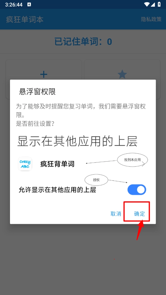 2、如图所示,开启悬浮窗权限后,系统能及时提醒您进行单词复习,请点击“确定”按钮。