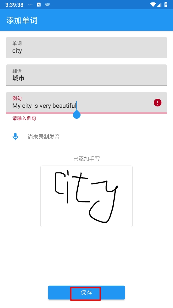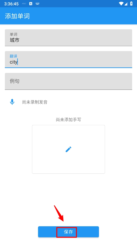 4、在主页输入单词、翻译以及例句,也能够添加手写内容。