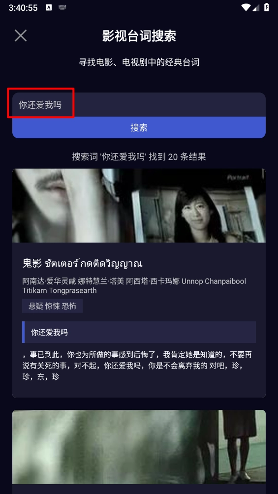 5、同时点击“影视台词”入口进入,输入关键词就能查找电影、电视剧里的经典台词。