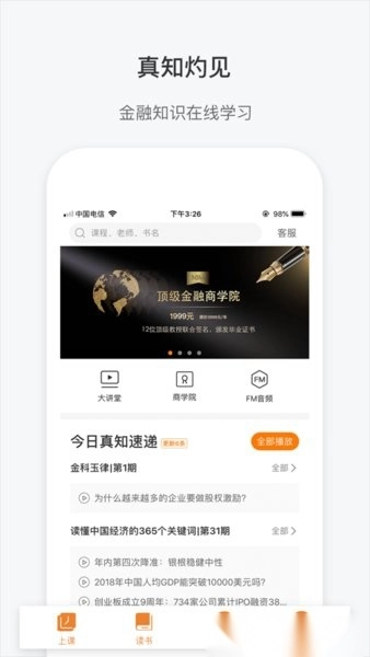 以提升用户金融知识为使命,通过专家、知名教授、独角兽企业家围绕金融知识与实践讲学。