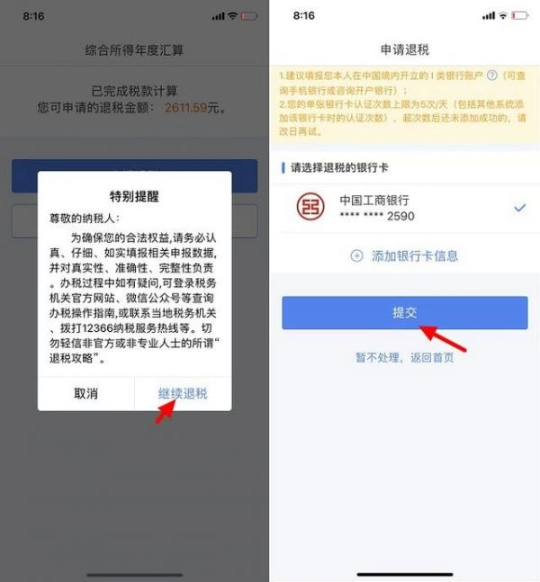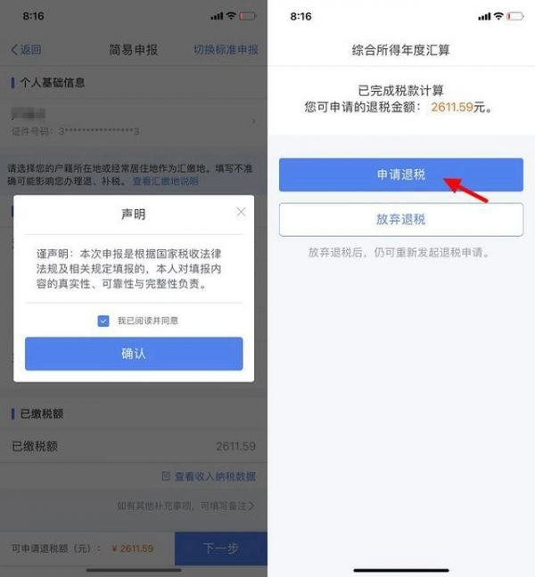 5、接下来的操作也很简单,根据提示勾选“我已阅读并同意”并点击下方的“确认”,再点击“申请退税”提交,如图所示。