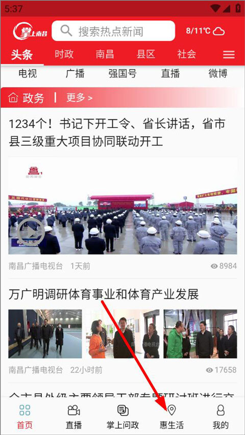 打开掌上南昌APP完成登录后进入首页,首页展示的是南昌本地的各类新闻头条,用户可以在这里浏览南昌时政动态、社会热点新闻,还能点击页面上的“惠生活”板块。