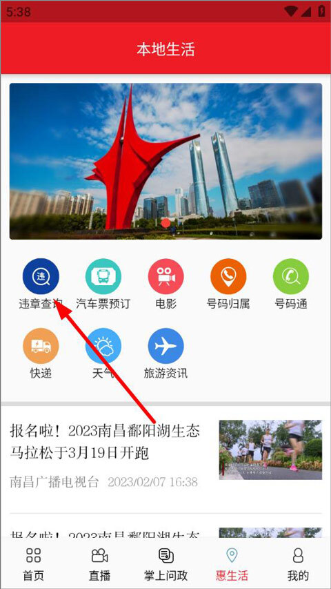 进入惠生活页面后,本地生活板块提供违章查询、汽车票预订、电影票购买、快递查询、天气查询等功能,用户也能浏览本地最新资讯,点击违章查询即可使用该功能。