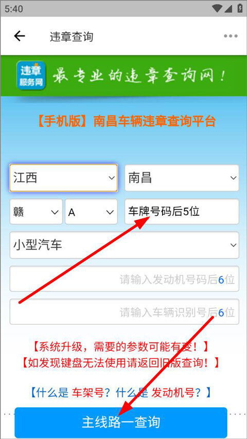 进入违章查询页面后,用户只需填写地址、车牌号码、发动机号码、车牌识别号等信息,点击主线路查询按钮就能完成操作。