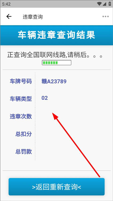 用户通过全国联网线路进行查询后,就能看到车牌号、车辆类型、违章次数、总扣分、总罚款等查询结果。