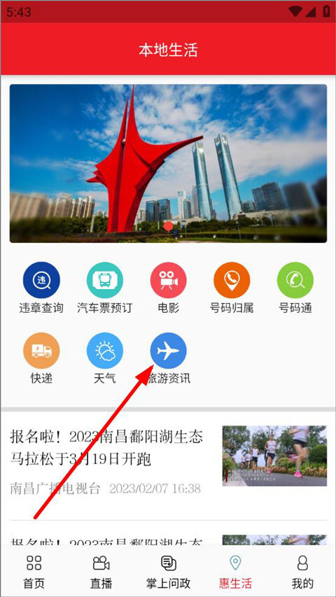 打开掌上南昌应用后,进入惠生活板块,此页面包含号码归属地查询、天气查询、快递查询等多种功能,随后点击旅游资讯选项。