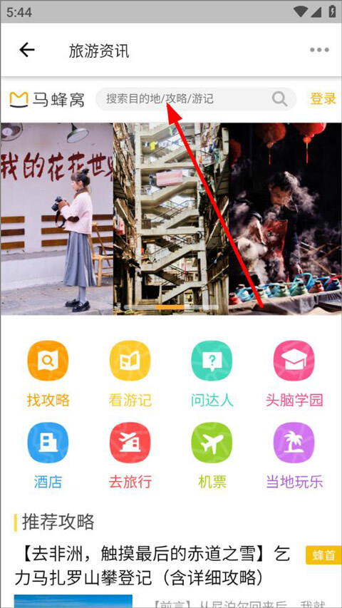 进入页面后,能看到找攻略、看游记、问达人、酒店、机票等功能板块,用户还可以搜索目的地、攻略或游记。