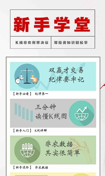 炒股入门亮点四:助力新手告别理财小白,新手学堂涵盖外汇mt4、黄金、原油、期货、股票等多种投资知识与技巧,帮助投资者实现进阶提升。