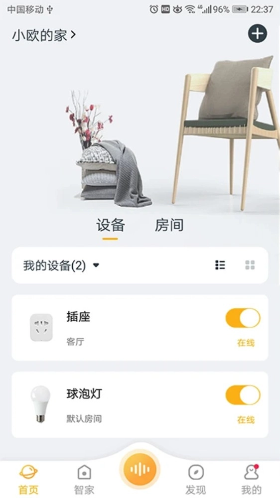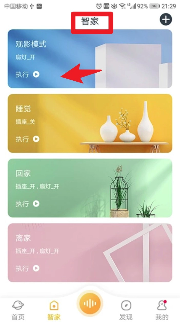 在「智家」页面能够一键启动已设置好的场景联动,例如回家时灯光自动开启、离家时插座自动关闭等。