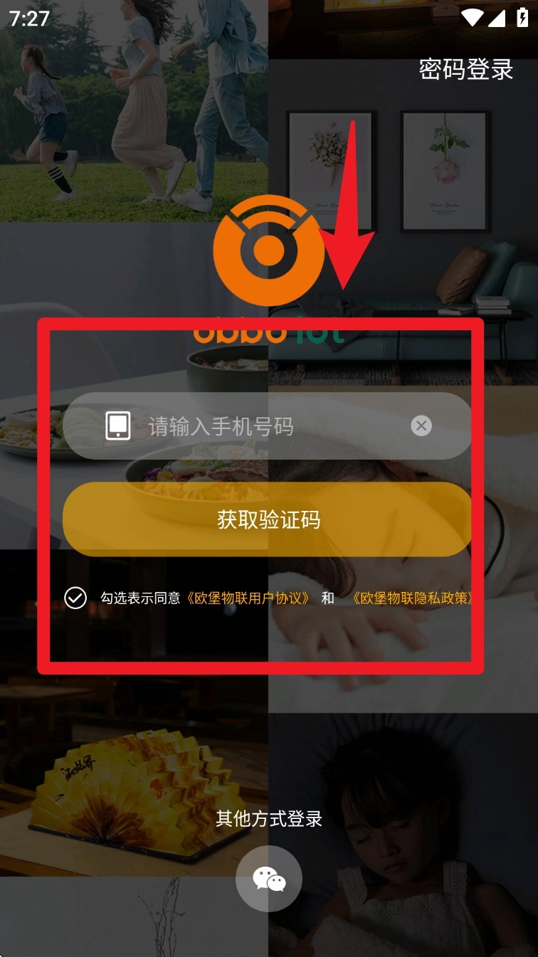 打开应用程序进入登录界面,输入手机号码并勾选相关协议,点击「获取验证码」按钮以完成快捷登录操作。