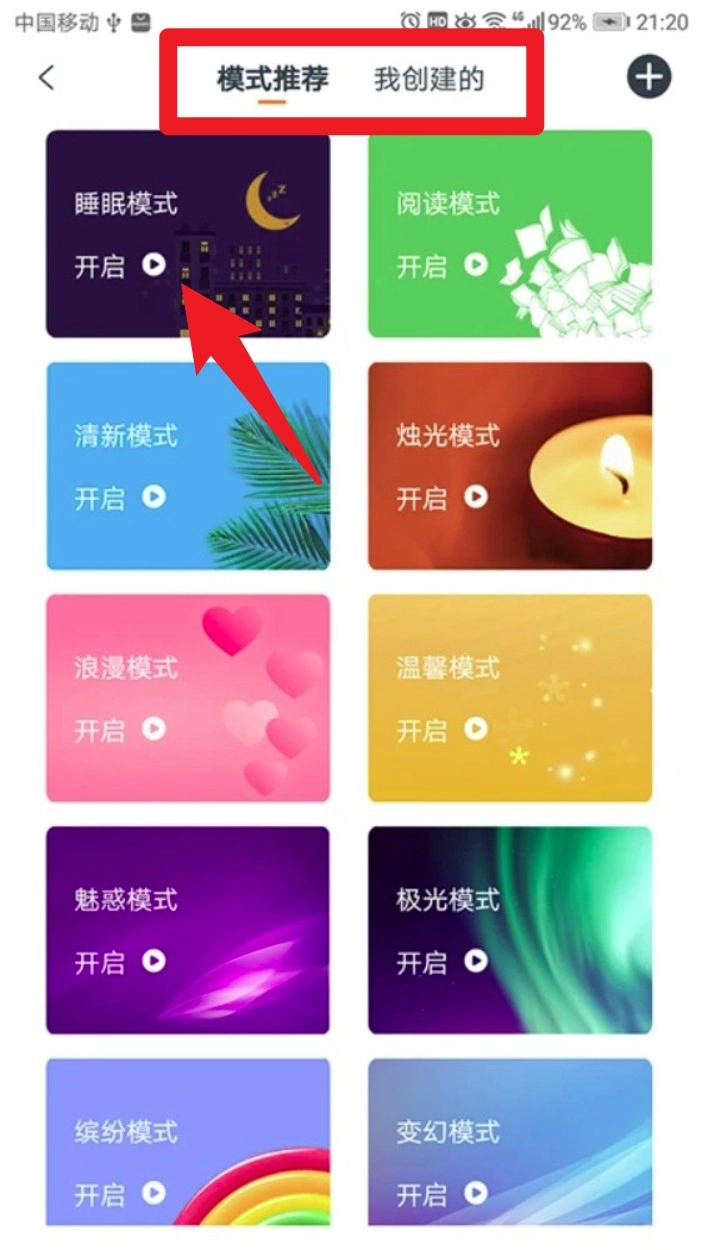 登录成功后,在首页找到并点击「模式推荐」标签,接着从睡眠、浪漫、极光等选项里挑选自己喜欢的模式。