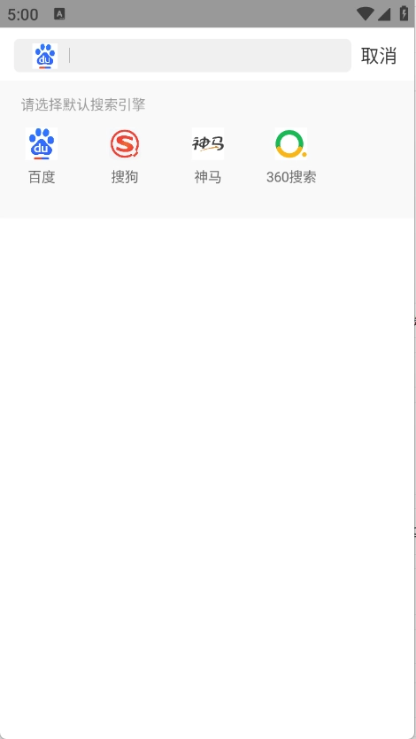 进入首页后,点击搜索框,默认使用的是百度浏览器,同时也可以选择搜狗、必应和360搜索等其他搜索引擎。