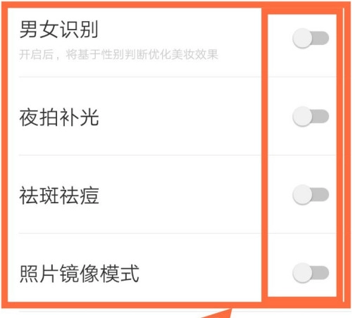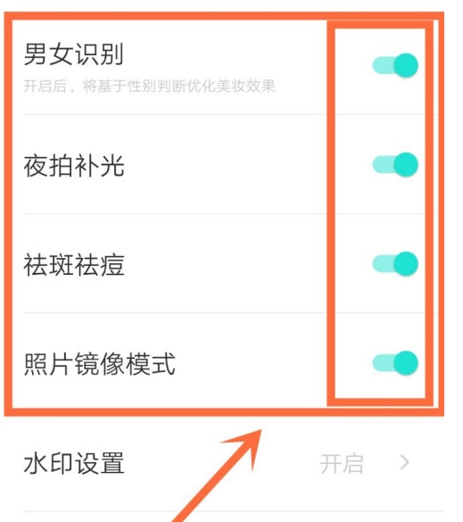 进入设置界面后,依次点击【男女识别】【夜拍补光】【祛斑祛痘】和【照片镜像模式】右侧的【开启按钮】即可。具体操作可参考下图。