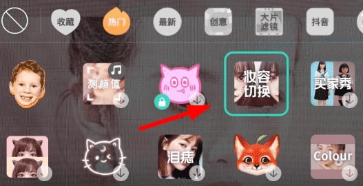 对于想要拍摄类似视频的用户,建议先在faceu激萌中设置妆容切换特效。具体操作是通过录制页面左下角的“贴纸”功能打开特效列表,然后从热门分类里查找并设置所需特效即可。