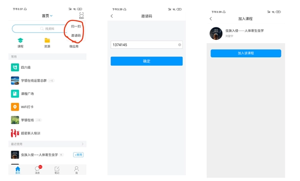 登录之后,点击右上角小图标,可以通过扫描二维码或者输入邀请码,点击“加入该课程”。