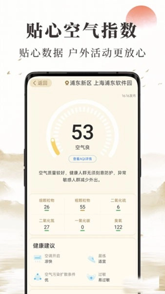 空气质量:实时在线监测您所在城市的空气质量数据,为您的身体健康保驾护航,助力您更合理地规划户外活动。