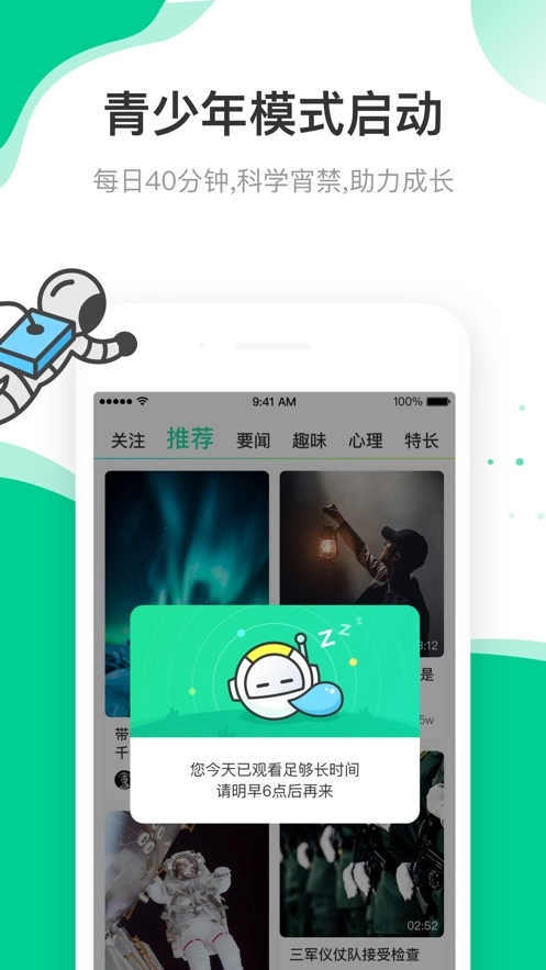 每天的总收看时长为40分钟,每日22点到次日6点会开启翠绿色的夜禁模式,以此守护未成年人健康快乐地成长。