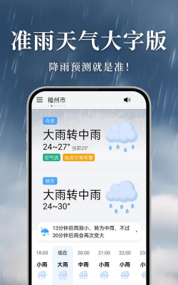 准雨天气免费可以及时的了解到每一个城市的天气情况,打开软件就可以输入自己想要查询到的城市信息,就可以很好的来了解到风向、温度、降雨情况等等丰富的信息资源的,还提供大字样式,满足老年人的需求,还可以为更多的伙伴们带来更多的天气情况,需要的伙伴们快来试试吧。