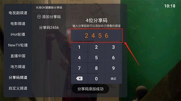 2、在分享码输入框中填入2456,就能添加更多影视频道;