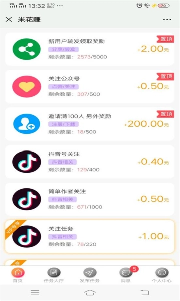 首码项目《米花赚》,扫码即可注册,这是一个集抖音点赞和任务发布接单功能于一体的平台。平台上任务种类丰富多样,数量繁多。用户每天能免费完成5个任务,任务报酬高低不等。提现时手续费按5%收取,最低提现金额为10元,支持支付宝提现,最关键的是该项目可以零成本参与!