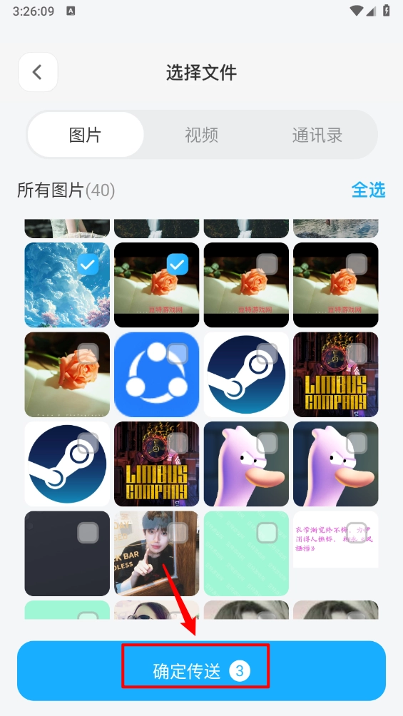2、在文件列表中,勾选想要传送的照片、视频、通讯录,点击“确定传输”。