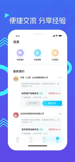 在线交流:配备在线聊天工具,便于用户和其他用户或招聘方沟通,使求职过程更便捷。