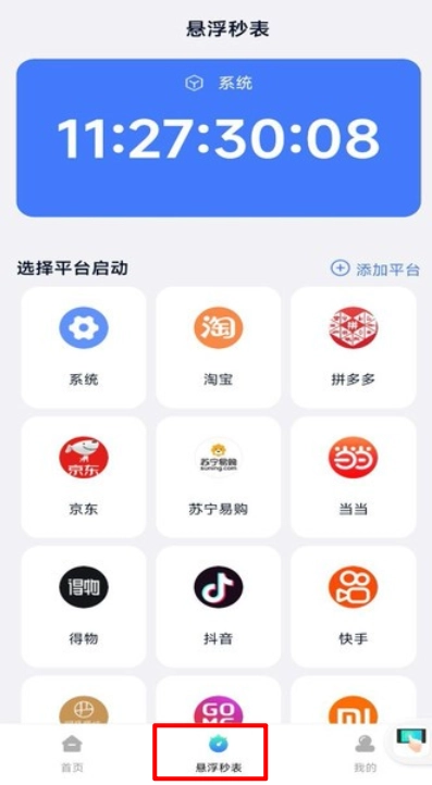 5、最后切换至"悬浮秒表"页面,就可以选择相应的平台进行计时秒表。