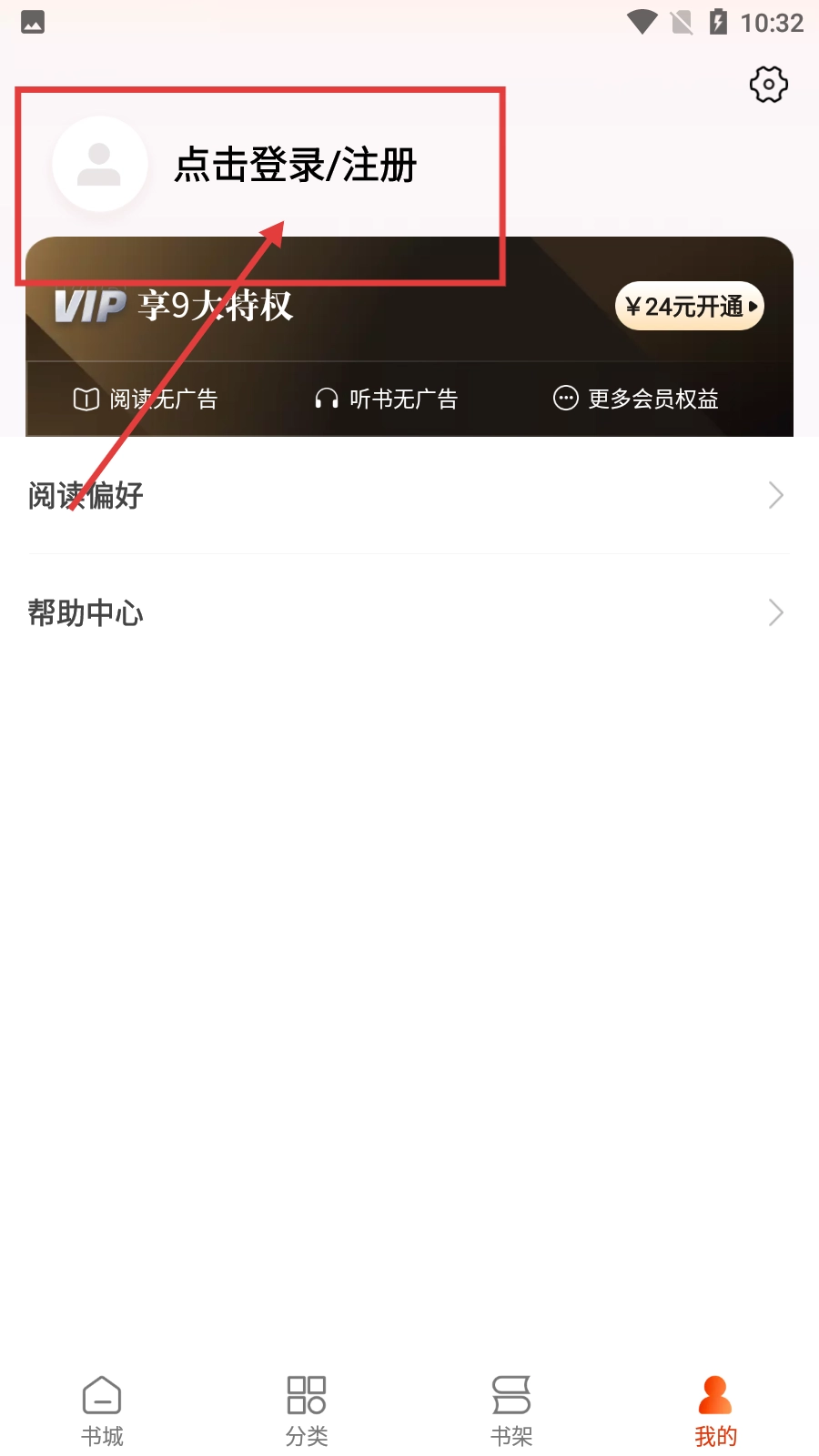 在书城界面中,点击底部的【我的】按钮,就能进入个人页面,在此可以开展登录、查看阅读偏好等相关操作。