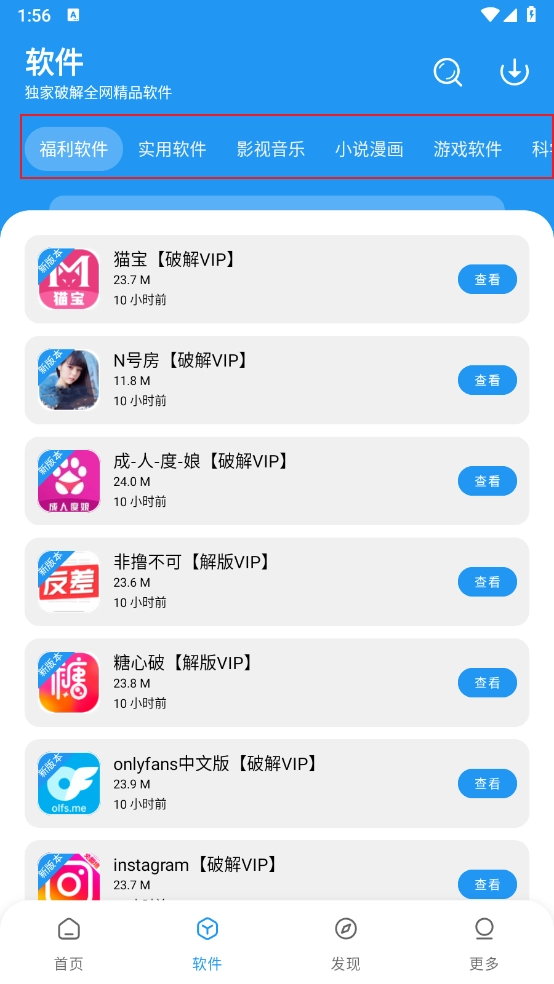 2、进入“软件”板块,这里有实用软件、游戏软件、福利软件等多种类型供你挑选。