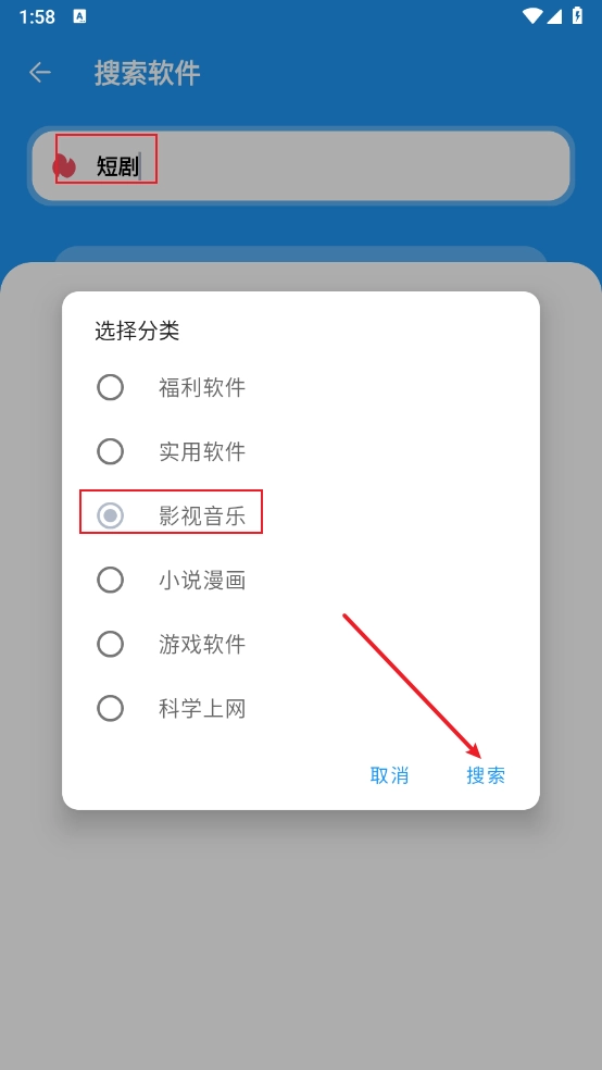 3、也能够点击搜索框一键查找喜爱的资源,如图所示,选择分类后点击“搜索”按钮即可。
