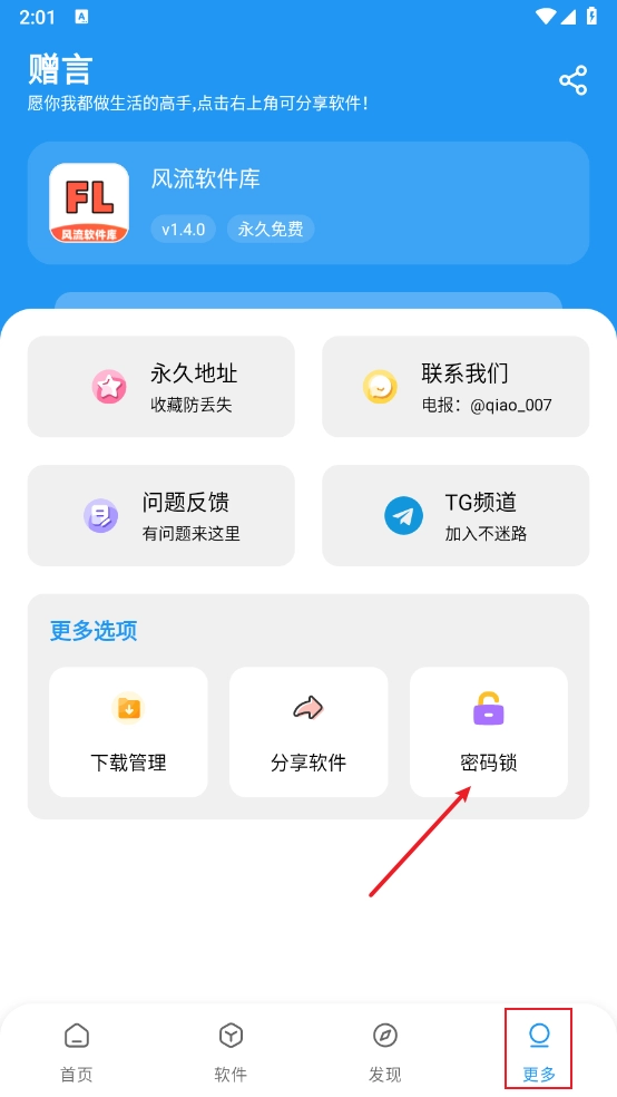 1、打开软件,找到“更多”板块并点击,接着点击“密码锁”进入相应界面。