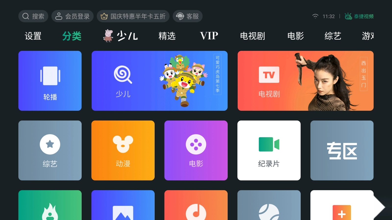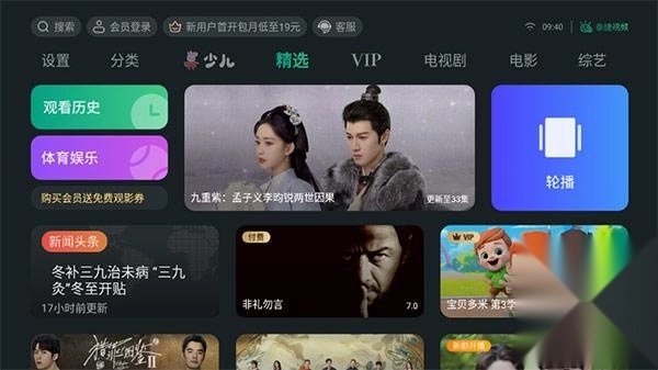 1、启动泰捷视频TV版应用,点击界面中的“轮播”选项即可观看相关视频内容。