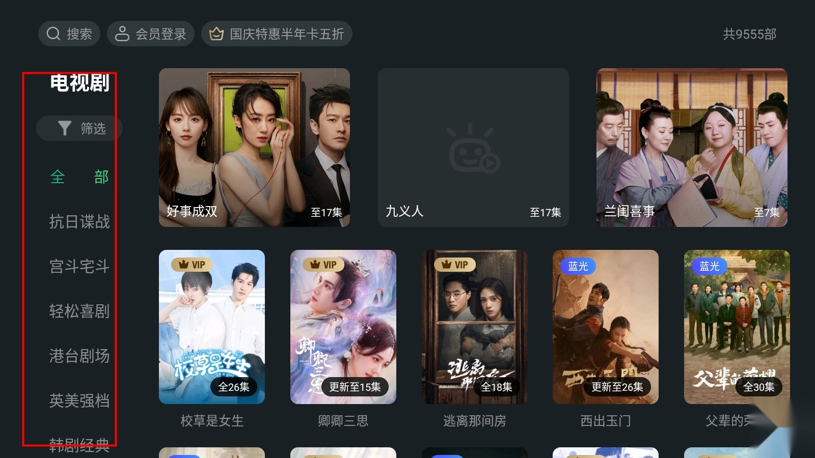 4、举个例子,当我们选择“电视剧”后,既可以通过上下滑动来挑选想看的剧集,也能选择具体的电视类别进行观看;