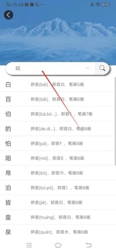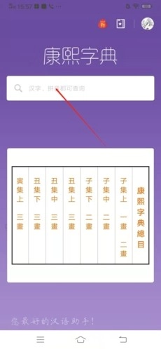 2、在搜索栏里输入你想查询的字,无论是部首、偏旁,还是该字的拼音都可以。