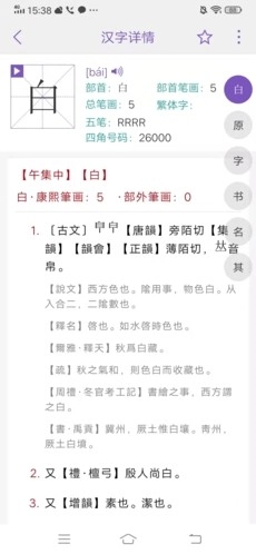 2. 精准的释义:每个汉字均配有详尽的释义,且会援引原文,以此保证释义的精准度与权威性。