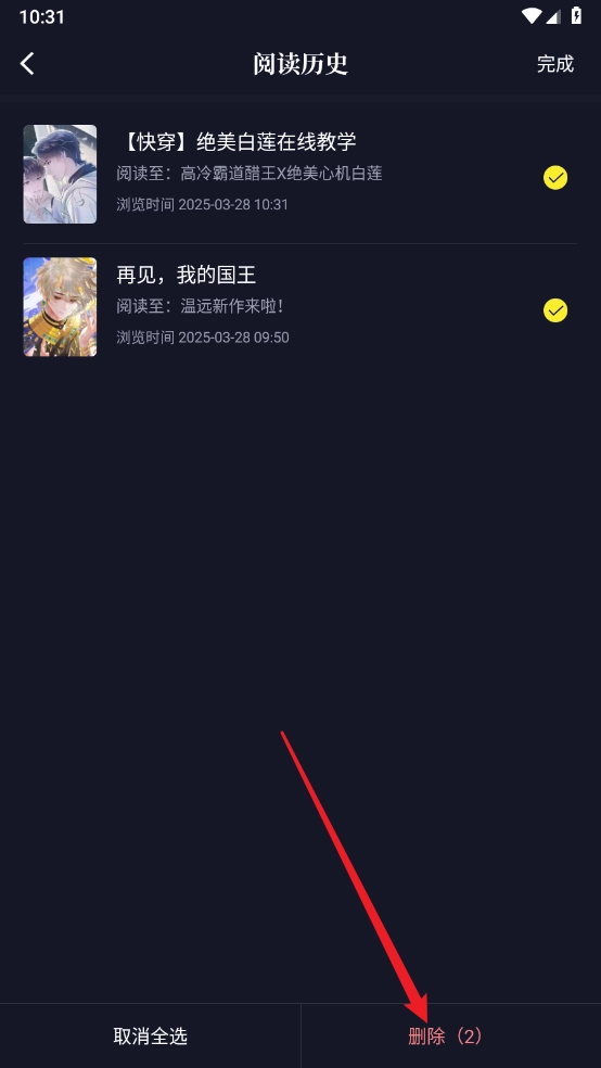 4、选择所需删除的历史阅读,点击"删除"即可。