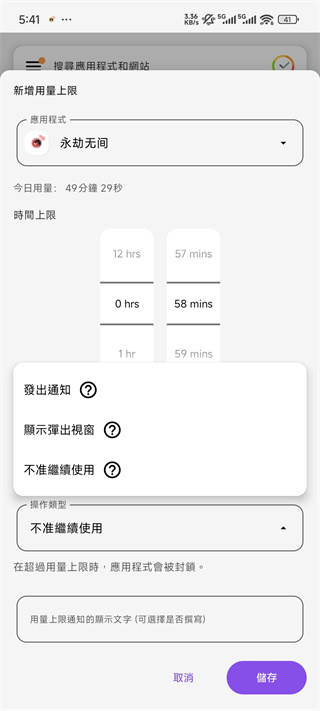 5、设置好上限时间后,选择发出提醒”显示弹出视窗”或不准继续使用”中的任一选项,点击储存即可完成操作。